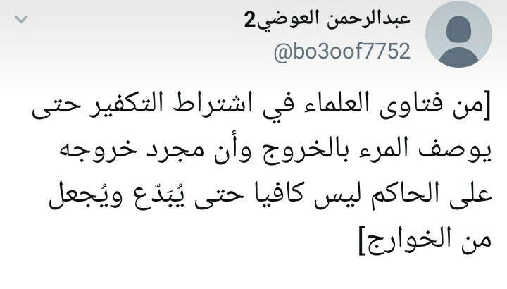 4. د. عبد الله البخاري صرح أن كتاب «ضوابط تكفير المعين» الذي قرر مذهب (بعض أئمة الدعوة وبعض العلماء المعاصرين) والذي قدم له الشيخ صالح الفوزان حفظه الله وأيد ما فيه وعلق عليه في مواضع، قال البخاري: «كتاب سيء يغذي فكر الخوارج»!!!، فهب العوضي2 لتأكيد هذا الطعن في (مقالة) في حسابه !