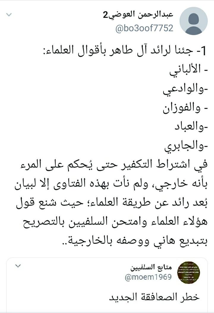 1. «عبد الرحمن العوضي2» حساب متخصص في الدفاع عن د. البخاري وعرفات في الغالب!، ولا يتفاعل معه أحد من رؤوس صعافقة المدينة!، ويغرد بحدة ضد الشيخ محمد بن هادي.