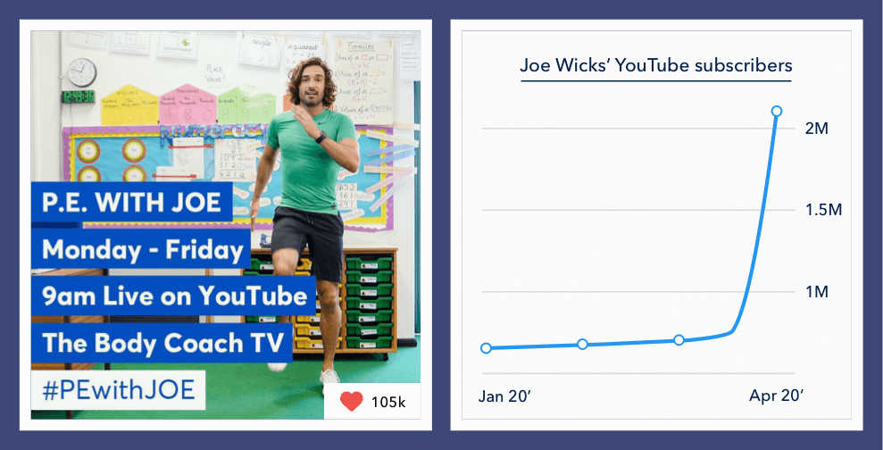 بعد إلغاء الدراسة لأجل غير محدود في معظم بلدان العالم، قام مدرب اللياقة البدنية جو ويكس @thebodycoach بعمل بث مباشر كل صباح على يوتيوب لتقديم دروس حول الرياضة واللياقة البدنية 💪 وحقق أكثر من 35 مليون مشاهدة على قناته.