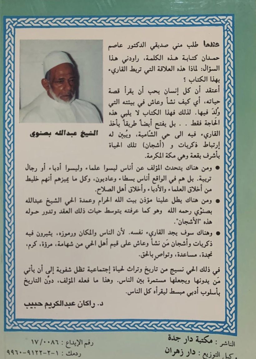 من كثر ما عاش #عاصم_حمدان في حي #الشامية وحفظ شوارعها وأزقتها وهي المجاورة للمسجد الحرام والتي كان الشيخ #عبدالله_بصنوي عمدة لها ألّف د. عاصم فيما بعد كتاب #أشجان_الشامية وهو الكتاب الوحيد تقريباً له فكل إصداراته كانت عن #المدينة_المنورة وكان هذا وفاء من د.عاصم لـ #مكة وللشامية