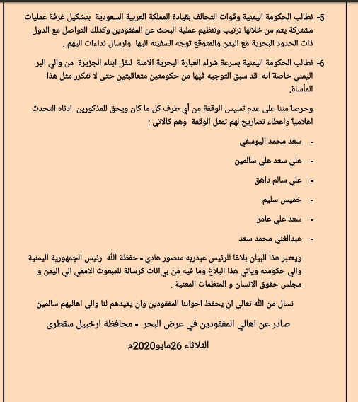 هذا بيان صادر عن الوقفة الاحتجاجية لأهالي المفقودين في البحر وعددهم 15 شخصا فقدوا مع قاربهم قبل 10 أيام وهم من #سقطرى.