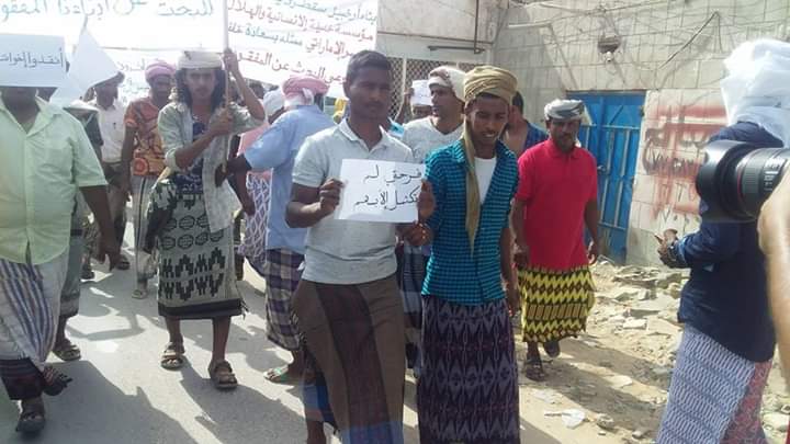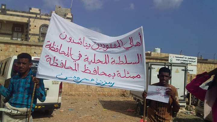 وحرصا منا على عدم تسييس الوقفة من أي طرف فقد كلفنا التالية أسمائهم بالتحدث إعلاميا عن المفقودين وهم سعد اليوسفي وعلي سالمين وعلي سالم داهق وخميس سليم وسعد عامر وعبدالغني سعد ويعتبر هذا البيان بلاغا للرئيس هادي والحكومة والمبعوث الأممي ومجلس حقوق الإنسان التابع للأمم المتحدة.