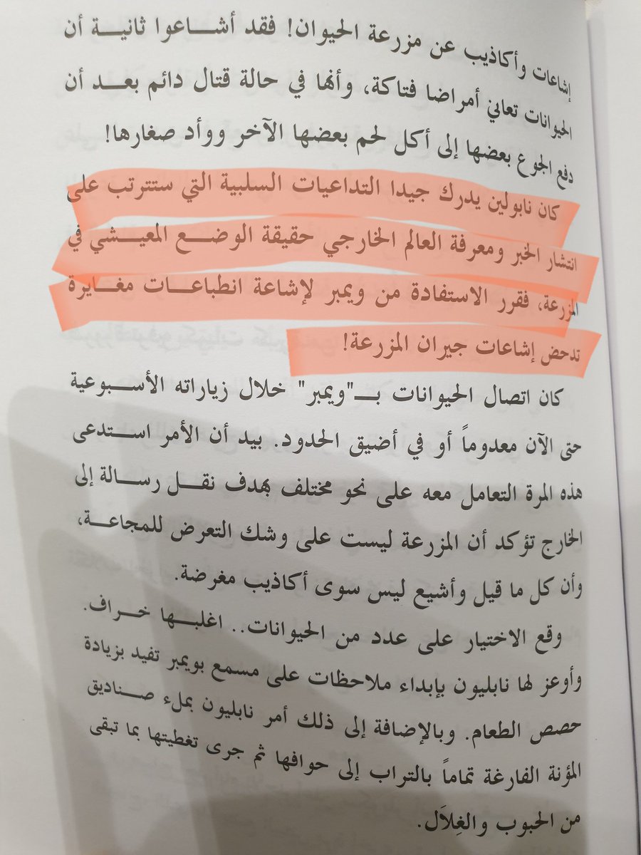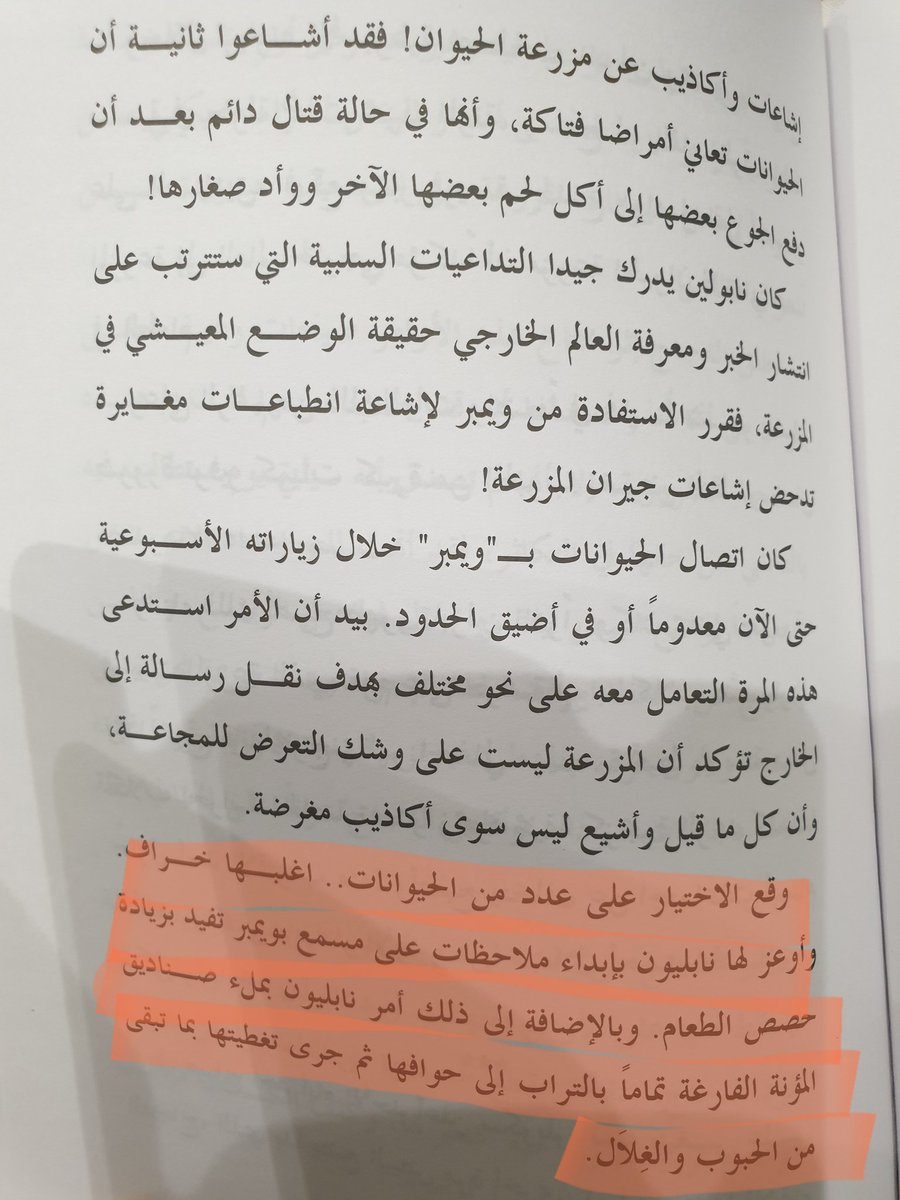 كان من الأهمية بمكان إخفاء هذه الحقيقة عن العالم الخارجي .. ولاسيما أن المزارعين أخذوا ، بعد هدم الطاحونة ، يروجون إشاعات وأكاذيب عن مزرعة الحيوان !