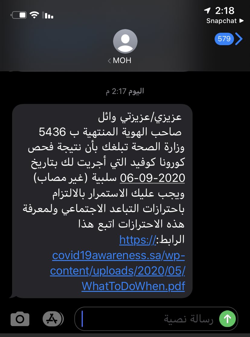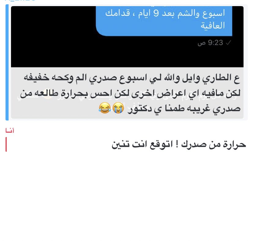 حاولت معاها تروح تفحص لكن رفضت بعدها بثلاثة ايام حسيت بكحة حادة وشكيت على طول رغم اني ما سخنت ولا صدعت اخذت ساعة من تطبيق اسعفني و رحت اقرب مستشفى بس كان مافي فحص قالو تعال المغرب