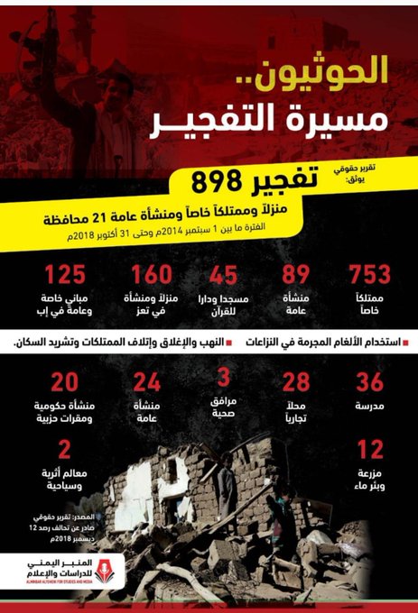 إحصائية ترصد مسيرة مليشيا الحوثي التفجيرية، منذ 1 سبتمبر 2014م حتى 31 أكتوبر 2018م، حيث فجرت عصابة الحوثي 898 منزلا ومسجدا ودارا للقرآن ومرافق صحية وتعليمية وموسسات حكومية ومقرات حزبية.