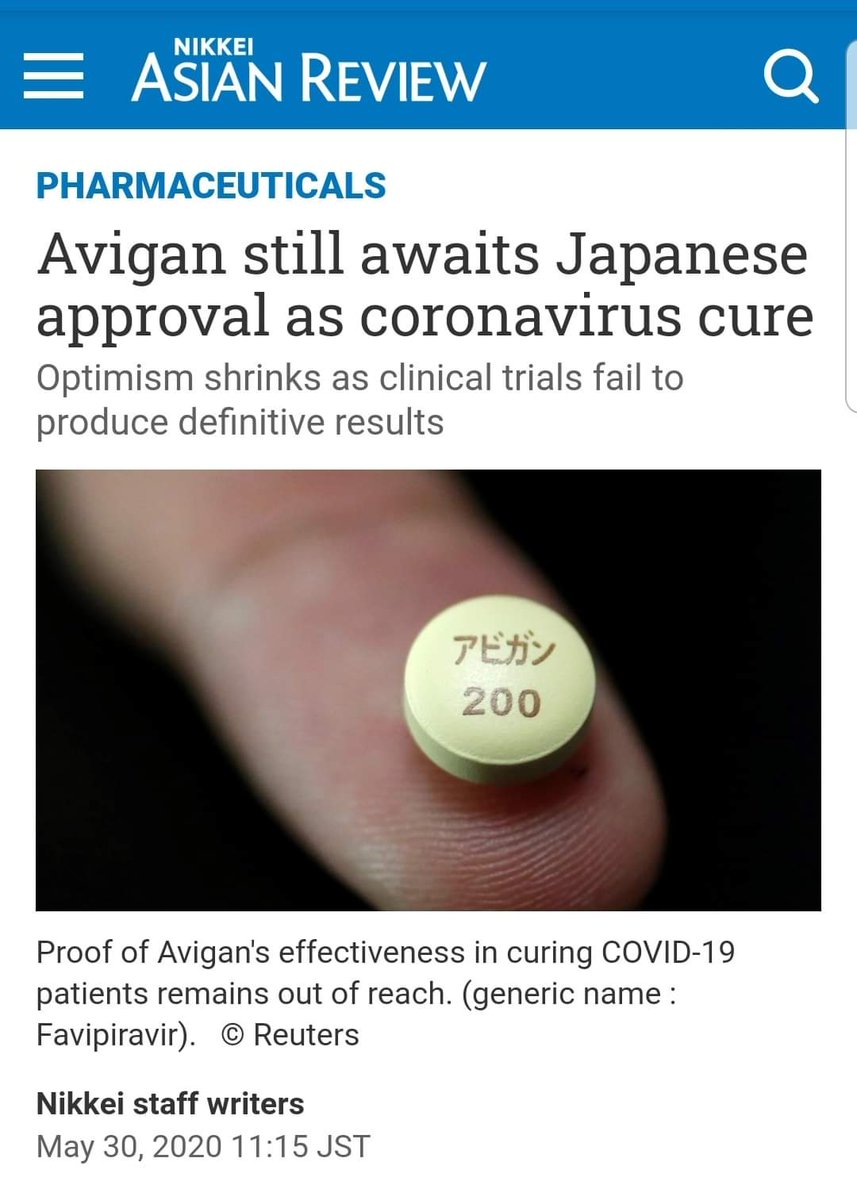 لم ترخصه الحكومة اليابانية بعد، رغم عزمها السابق في ذلك أواخر مايو، بسبب أن النتائج الوسيطة للتجارب لم تثبت فعالية صارخة فتقرر تأجيل القرار لنهاية يونيو حين تكتمل التجارب السريرية.