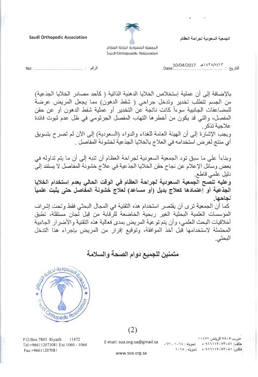 سبق وأن فصلت الجمعية السعودية لجراحة العظام @SOAorg في بيان نشرته مسبقاً عن علاج الخشونة بالخلايا الجذعية.