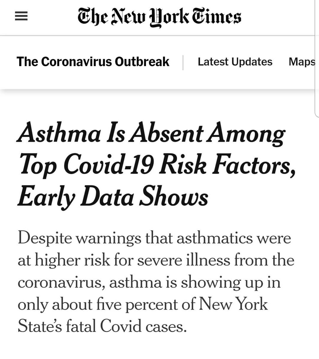 السلطات الصحية الرسمية كمركز التحكم بالأمراض الأمريكي CDC (٢) من خطر الكورونا على أصحاب الربو المتوسط والحاد، إلا أن الواقع بكل مكان لا يزال يكذب هذه المخاوف!