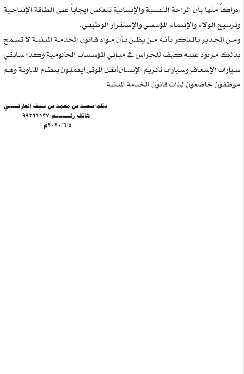 الأساسي للدولة"إقامة نظام إداري سليم يكفل العدل والطمأنينة والمساواة للمواطنين.. إلخ" للعمل اسوة بالجهات العسكرية والأمنية في محافظة الوسطى بنظام المناوبة وكذا شركات القطاع الخاص التي بالرغم من غايتها الربح تعمل بنظام المناوبة، ولا شك بأن العمل لديها بنظام المناوبة لم.. بتبع،