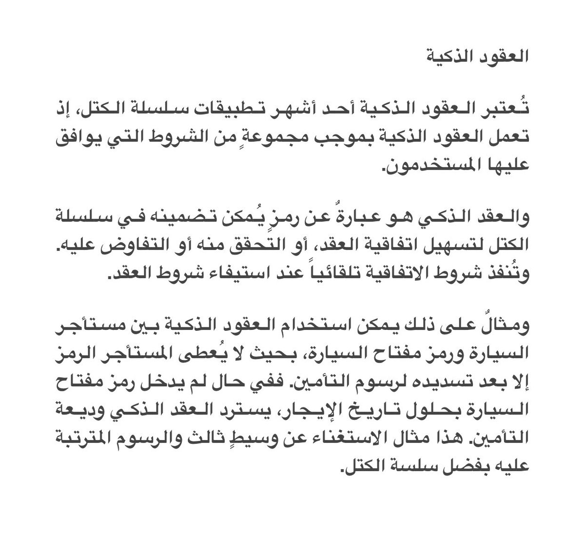 "في عام 2011، بدأ استخدام العملات المشفرة في التطبيقات المتعلقة بالمعاملات النقدية، وظهرت أنظمة تحويل العملات والمدفوعات الرقمية في عام 2013، وبعدها العقود الذكية بقليل، وتوالت التطورات في المجال حتى هذه اللحظة، لتتضمن عقود توحيد السوق والتطورات الفرعية الأخرى."