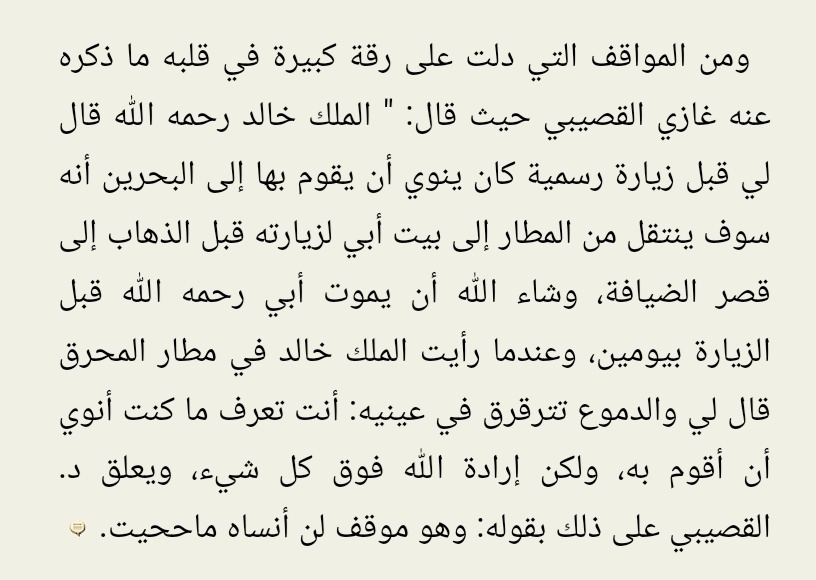 (أخبرني طبيبه الخاص مرة أنه لم يرَ في حياته كلها إنسانا أكثر جلدا على الألم واقل إظهارا له من #الملك_خالد_بن_عبدالعزيز كان إيمانه العميق يقود إلى تقبل كل ما قدره الله عليه برحابة صدر، لم يشعر قبل أي عملية من العمليات الجراحية الدقيقة الثلاث التي أجراها)