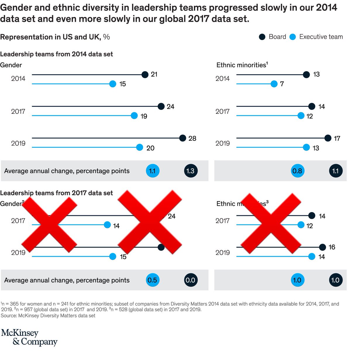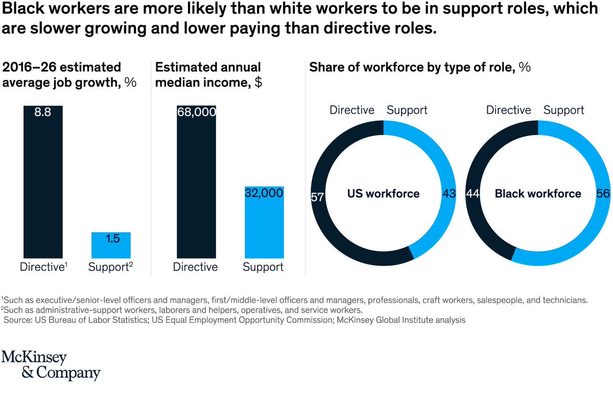 نشرت "ماكينزي آند كومپاني" بعض التقارير حول تفاوت الأجور وفرص التطور الوظيفي بين ذوي البشرة السوداء وذوي البشرة البيضاء في الولايات المتحدة؛ والتكلفة الاقتصادية لعدم المساواة/العدالة بينهما.