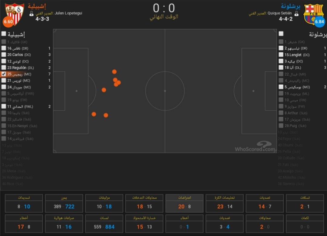 دفاعيا اولا ، وعلى مستوى الاعتراضات ، بلغ عدد اعتراضات #اشبيلية 20 إعتراض مقابل 8 إعتراضات فقط ل #برشلونة