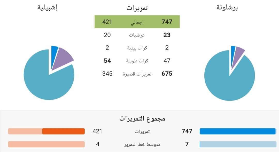 اذا ما استبعدنا التمريرات القصيرة فبقية ارقام التمريرات متعادلة ( الكرات البينية 2 : 2 ) او متقاربة ( 23 عرضية مقابل 20 ) ، او الافضلية فيها ل #اشبيلية ( 54 كرة طويلة مقابل 47 ) . والعبرة ليس فقط في العدد ؛ لكن في الفعالية .
