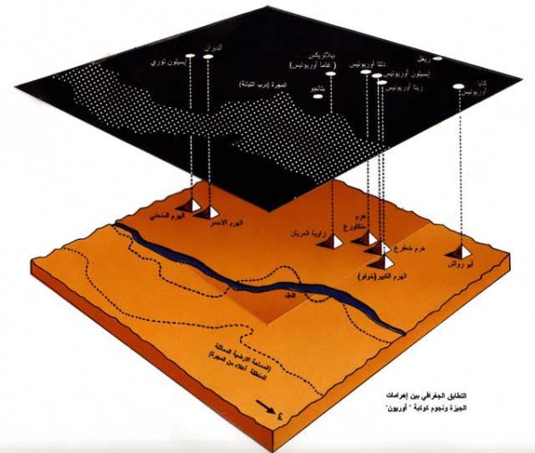 نجوم حزام أوريون الثلاثة(النطاق– النيلام–المنطقة)بحسب الأسماء العربية خط يمر بمركزي النطاق والنيلام والمنطقة أبعد قليلا وأهرامات الجيزة الثلاثة (خوفو–خفرع–منقرع) خط يمر بمركزي هرمي خوفو وخفرع ومنقرع أبعد قليلا بنفس النسبة 👇