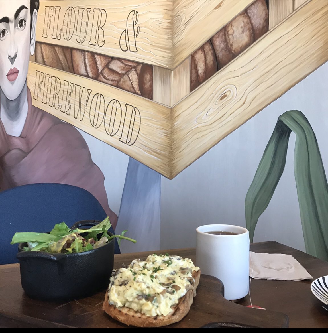 ٥-دقيق و حطب: المخبز الكوزي(الملموم) اللي يعطيك انطباع اوربي دافي بأطباق من المنقوشة والبيض بطابع بسيط ولذيذة وبسعر متوسط.