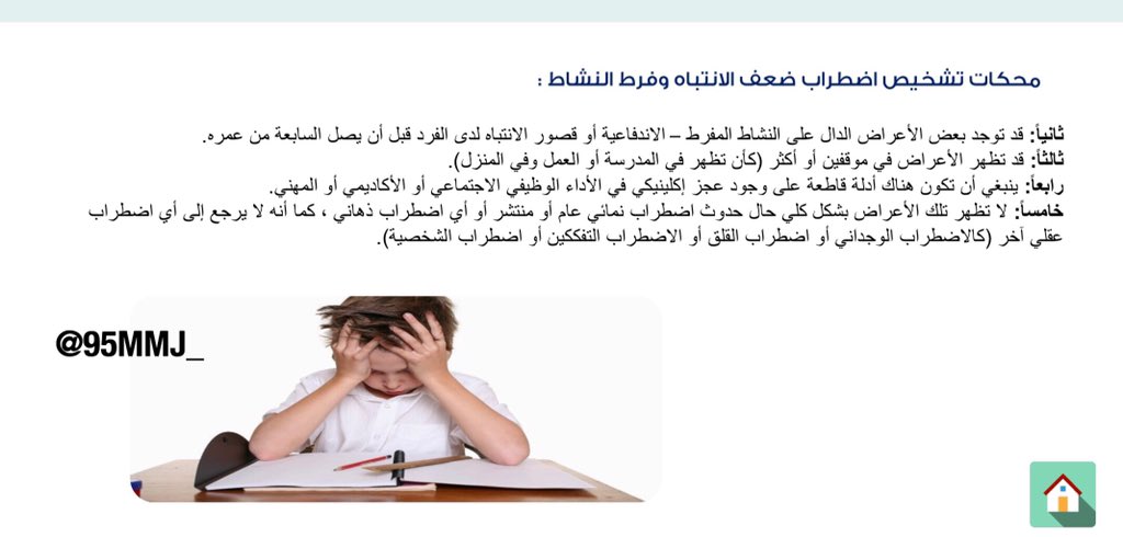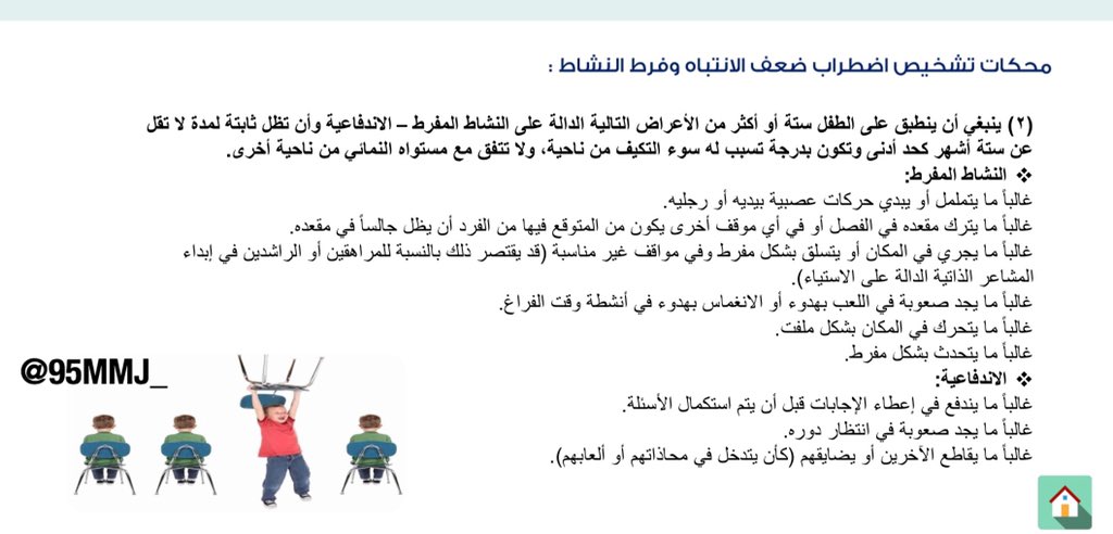 الأساليب التربوية المستخدمة مع اضطراب #ADHD داخل الفصل الدراسي وهي تتضمن مساعدة الطفل على متابعة سلوكه وتقليل المثيرات المشتتة داخل الفصل ووضع جدول يومي وإزالة المسببات التي تؤدي لحدوث السلوك وأيضاً وضع قائمة أمام الطفل وتدريبه على أن يكون يتحكم بسلوكه ويسيطر عليه @special_n_