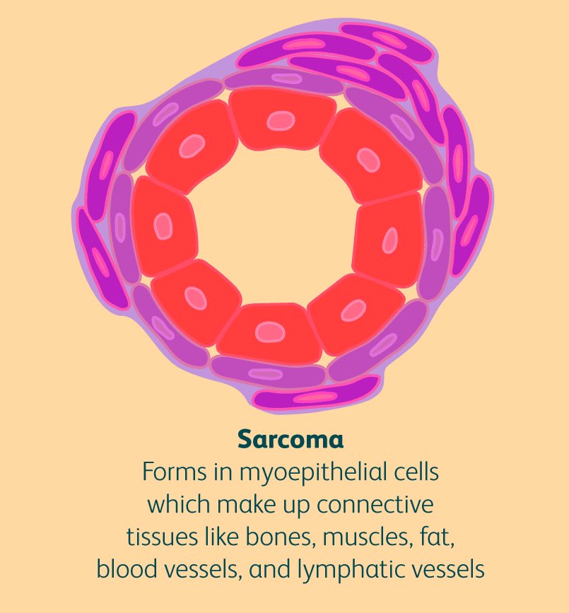 ٢- ساركوما (Sarcoma) تنشأ هذه الأنواع من السرطان في الأنسجة الضامة (Connective tissues) كالعظام والغضاريف والعضلات وهذه الأنواع نادرة جداً حيث تبلغ نسبتها أقل من ١٪ من اجمالي حالات السرطان حول العالم.