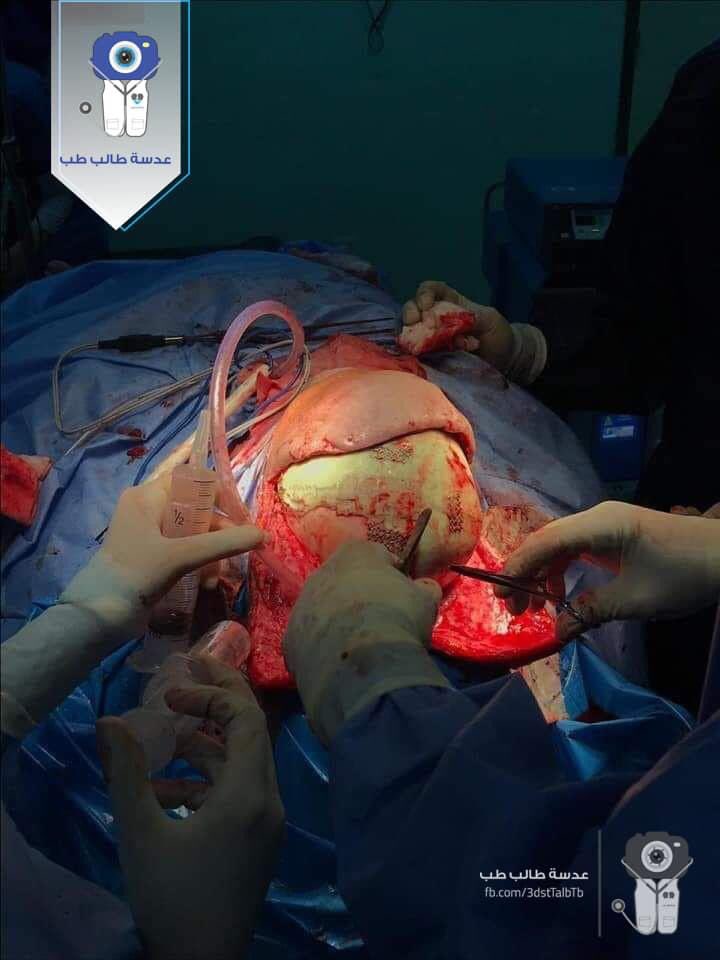 🔸بعد مدة سبع شهور تم ادخال المريضة و اجراء عملية تجميلية للجمجمة عن طريق الجمجمة الاسمنتية ثلاثية الابعاد التي تم تصميمها مسبقاً في بلجيكا.