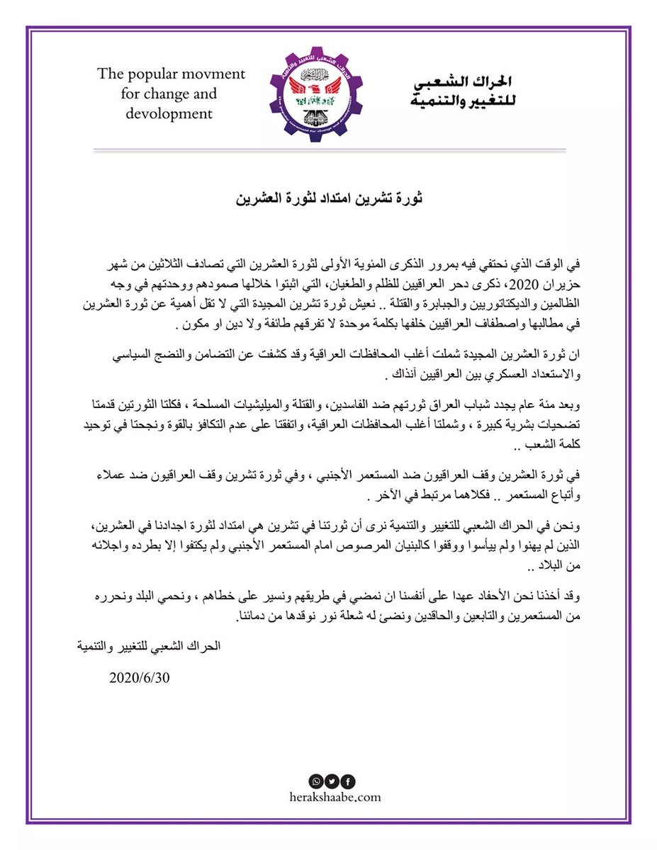 ونحن في الحراك الشعبي للتغيير والتنمية نرى أن ثورتنا في تشرين هي امتداد لثورة اجدادنا في العشرين، الذين لم يهنوا ولم ييأسوا ووقفوا كالبنيان المرصوص امام المستعمر الأجنبي ولم يكتفوا إلا بطرده واجلائه من البلاد ..