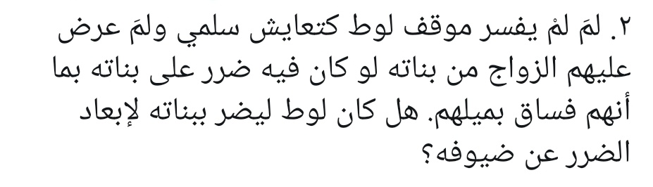 وأما تعريض بناته للرجال المنحرفين فينبغي الالتفات إلى أن لوطا ع لم يُعرّض بناته إلا للحلال، فلا يشترط في النكاح صلاح الزوج، ومن هنا قد تضطر المرأة للزواج برجل أو العكس لمراعاة بعض المصالح والمفاسد ودفع أهون الضررين، والذي قام به لوط ع كان من هذا القبيل؛ =