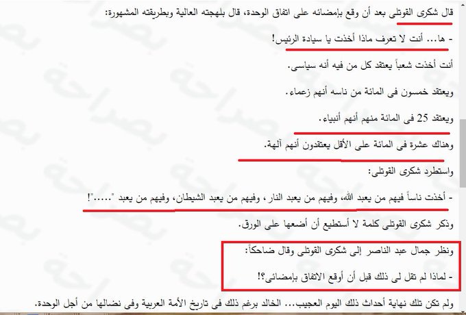 في مقالة بعنوان "ما الذى جرى فى سوريا؟" نشرها هيكل عن أسباب فك #الوحدة_المشئومة بين مصر وسوريا، نقل وصف القوتلي للسوريين بعد ما وقع اتفاق الوحدة مع جمال عبد الناصر
