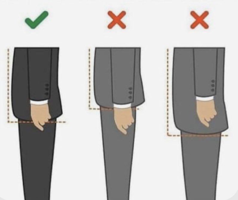 يجب أن يكون حافة الجاكيت عند منتصف الكف أي عند مكان التقاء الأصابع بالكف، كما موضح بالصورة، إذا كان طول الجاكيت يصل إلى أعلى الكف فهو قصير، واذا كان أطول من اليد فهو طويل جداً وهذا يؤثر على منظر البدلة والجسم بشكل عام.