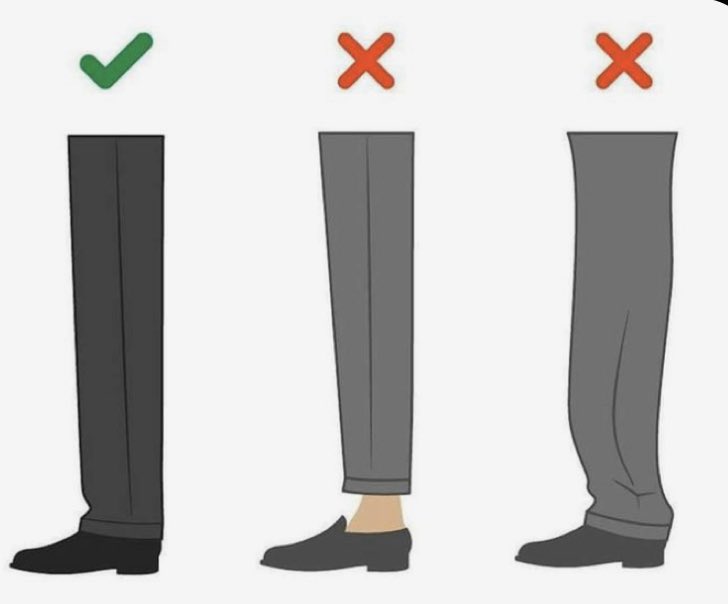 المتعارف عليه في اللباس الرسمي أن يكون طول البنطلون ملامساً للحذاء وتسمى هذه الثنية التي تتكون من وقوف البنطلون عند حافة الحذاء "Break” هذه الثنية يجب أن تكون صغيرة بحيث لا يتجمع القماش فوق الحذاء فيبدو بشكل غير مرتب، ومن الخطأ أن يرتفع البنطلون عن طرف الحذاء.
