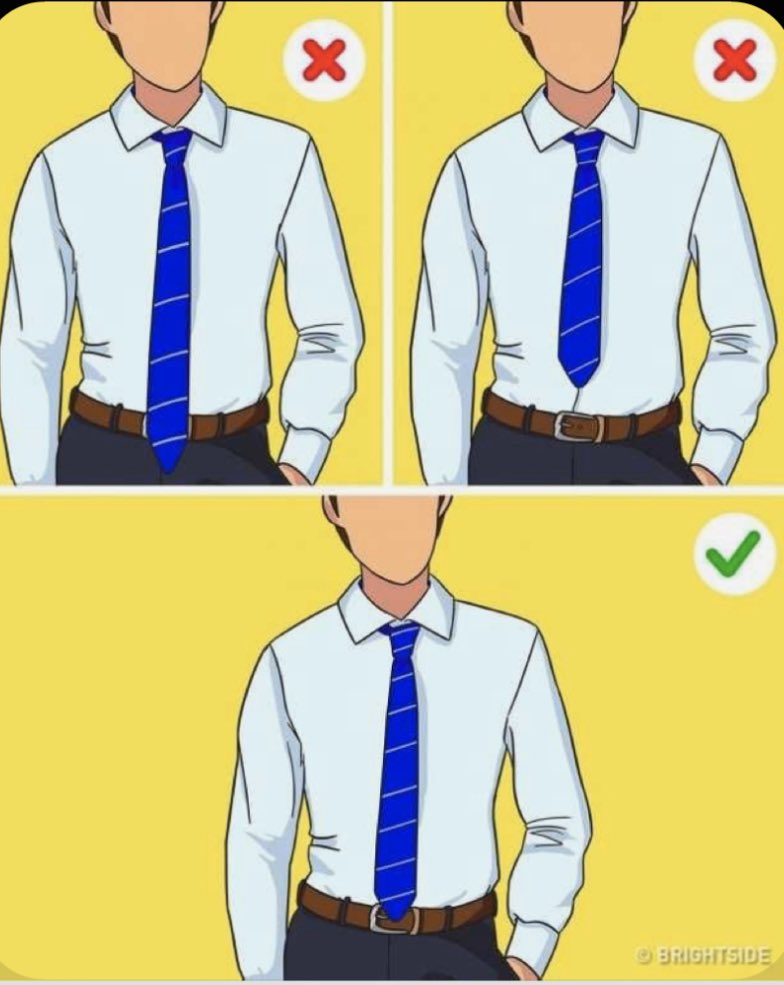 يجب أن يصل طرف ربطة العنق إلى منتصف الحزام أو خصر البنطلون كما هو موضح بالصورة.
