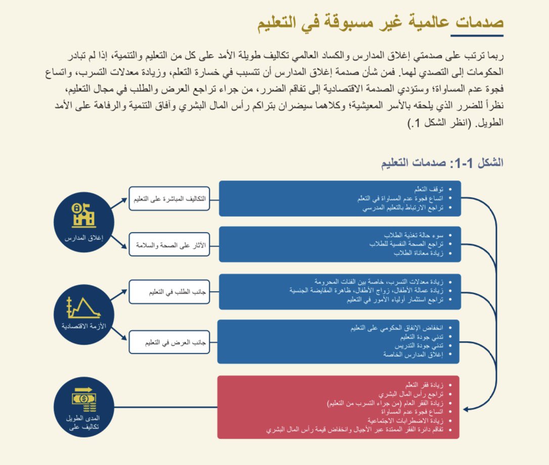 1. أكد تقرير مجموعة البنك الدولي أن جائحة كوفيد - 19 أثرت بشكل كبير على التقدم المحرز في مجال التعليم العالمي وذلك من خلال صدمتين رئيسيتين