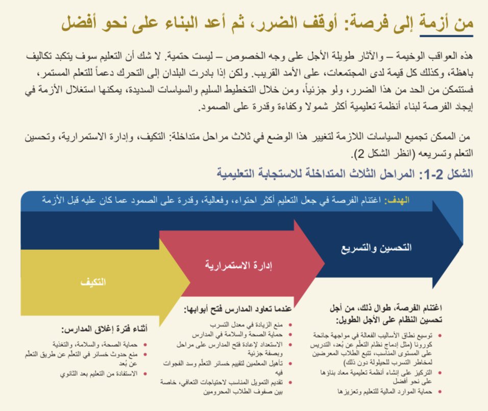 5. كما إقترح القائمون على هذا التقرير الذي يقوده مسؤول اقتصاديات التعليم هاسلي روجرز ويشرف عليه المدير العام لقطاع الممارسات العالمية للتعليم بالمجموعة خايمي سافيدرا ثلاث مراحل سريعة تكون بمثابة استجابات لازمة لتجاوز هذه المرحلة العالمية الصعبة