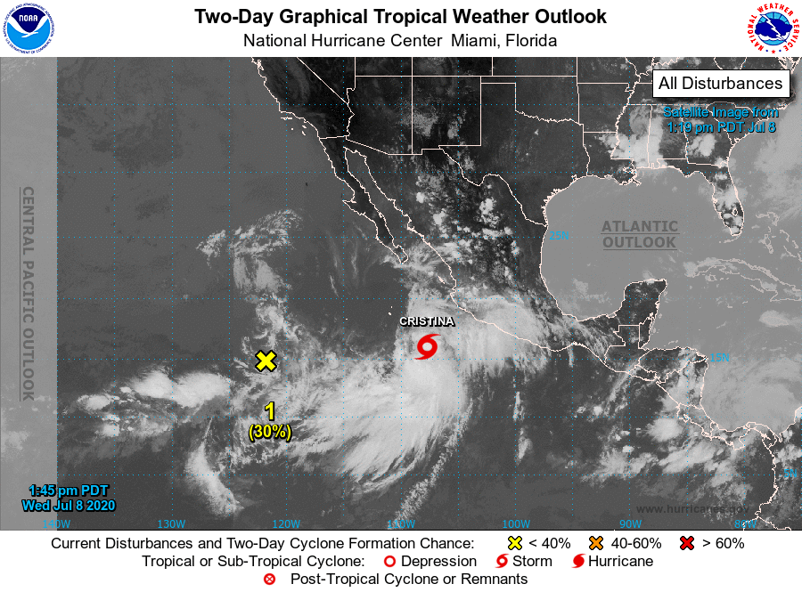 تستمر العاصفة الاستوائية كرستينا بالتحرك الى الشمال الغربي مبتعده عن سواحل المكسيك بسرعه 13 ميل ورياح تصل سرعتها الى 60 ميل في الساعة في عمق المحيط الهادئ حيث من المتوقع تحولها الى اعصار مساء الخميس بالتوقيت المحلي مع وجود منطقة اخرى الى الجنوب منها قيد التشكل