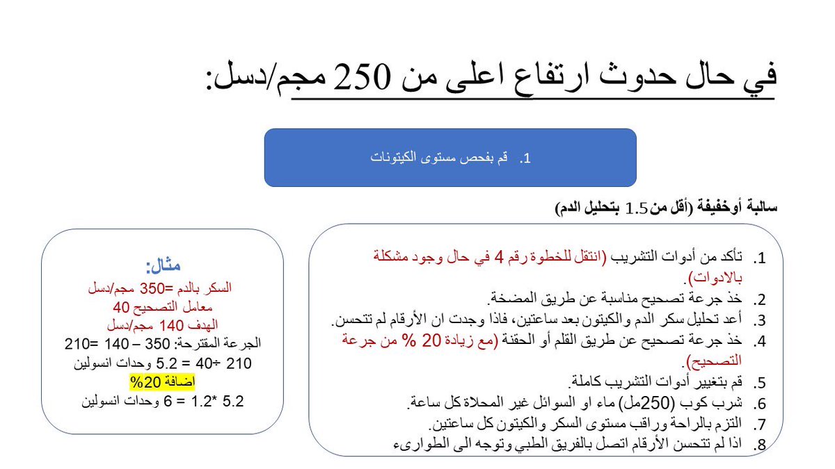 🔴 يتوجه المصاب للطوارئ اذا كان الارتفاع شديد (اعلى من ٣ مليمول ) او اذا كان غير متأكد عما يجب فعله.