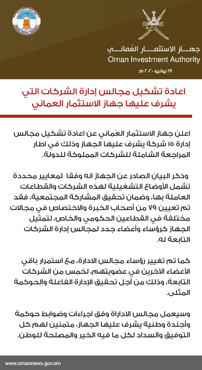 #جهاز_الاستثمار_العُماني يعلن عن اعادة تشكيل مجالس إدارة 15 شركة يشرف عليها الجهاز وذلك في اطار المراجعة الشاملة للشركات المملوكة للدولة.