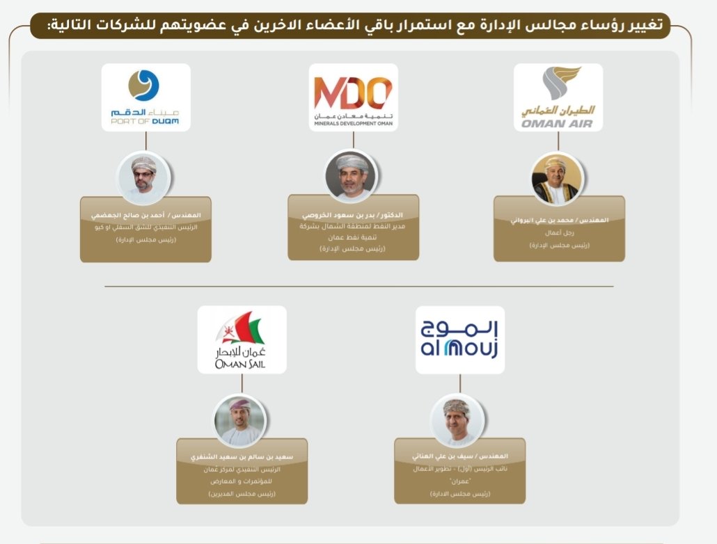 تعيين 79 من أصحاب الخبرة والاختصاص في مجالات مختلفة في القطاعين الحكومي والخاص، لتمثيل جهاز الاستثمار العماني كرؤساء وأعضاء جدد لمجالس إدارة الشركات التابعة له.
