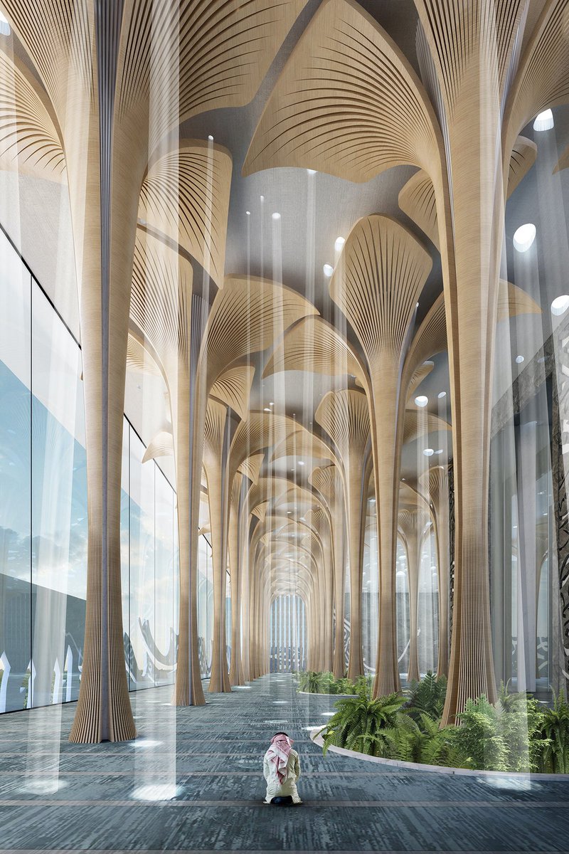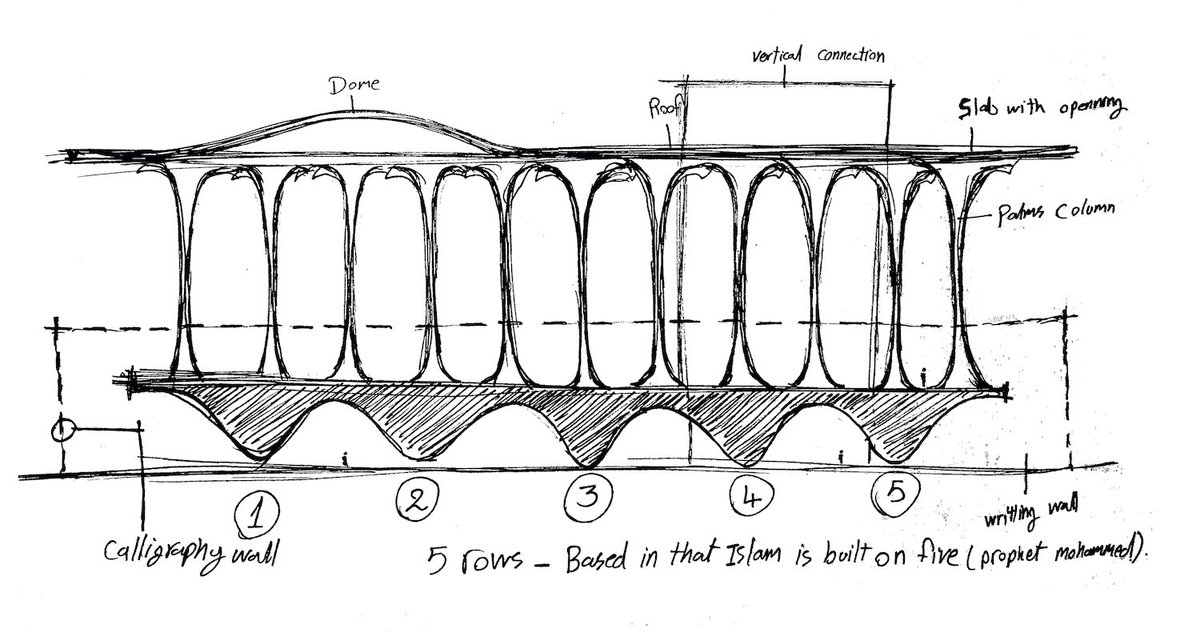 أهم نبات في الواحة هو النخيل، لذلك تصميم المسجد عبارة عن أعمدة تمثل النخيل التي تخلق ظل للجميع في الواحة، وتتخللها فتحات من السطح، تمثل تلك الفراغات بين سعفات النخيل.