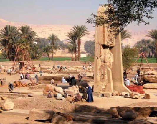 أكبر معبد تم بناؤه في مصر القديمة،والذي تضمن معابد الآلهة،وطرق المعالجة،والحدائق،وحمامات السباحة،وورش العمل،والمخازن،ودور الكنوز،ومساكن الكهنة والمباني الإدارية.لقرون،كانت الآثار الوحيدة لهذا البناء العظيم هي تمثال ممنون عند مدخل معبده في الضفة الغربية للنيل بالقرب من الأقصر #مصر
