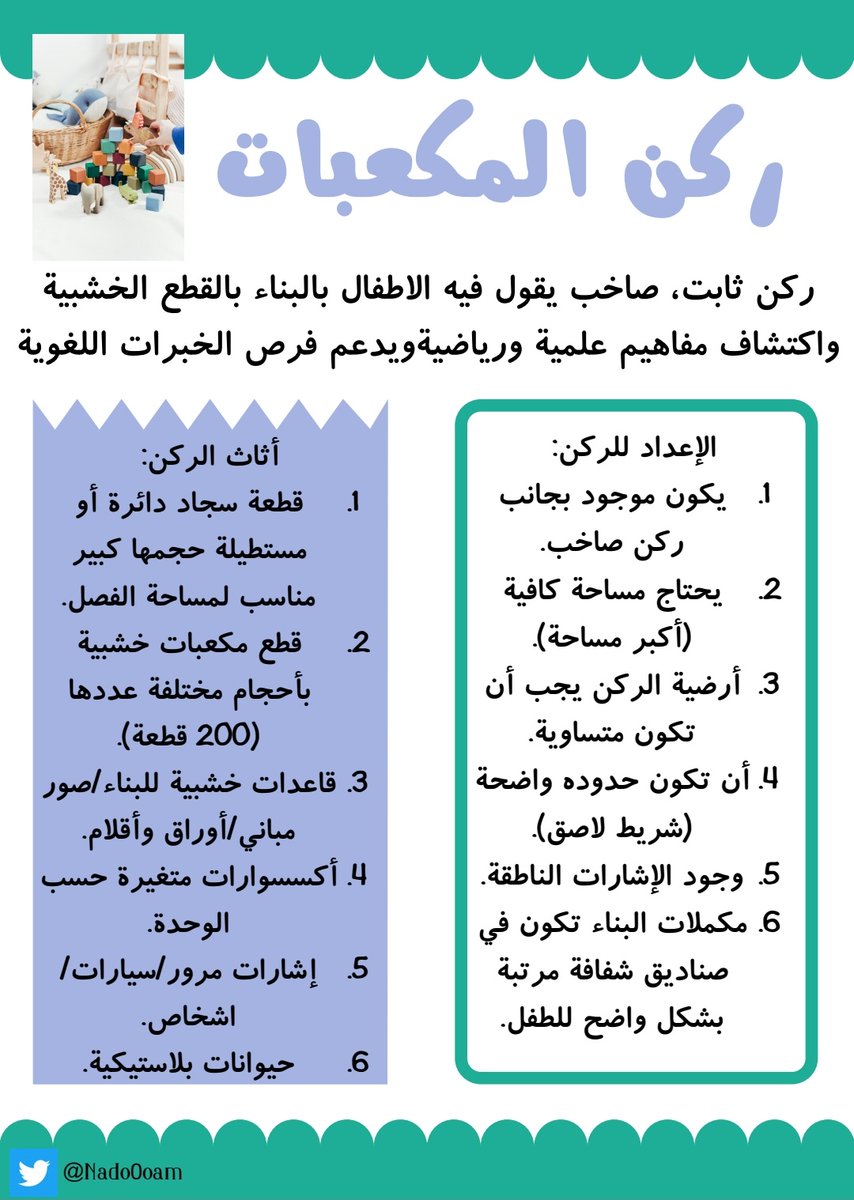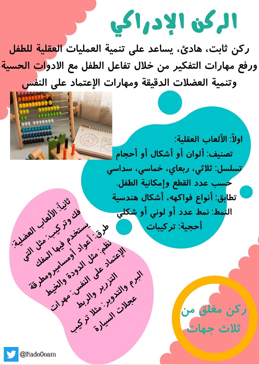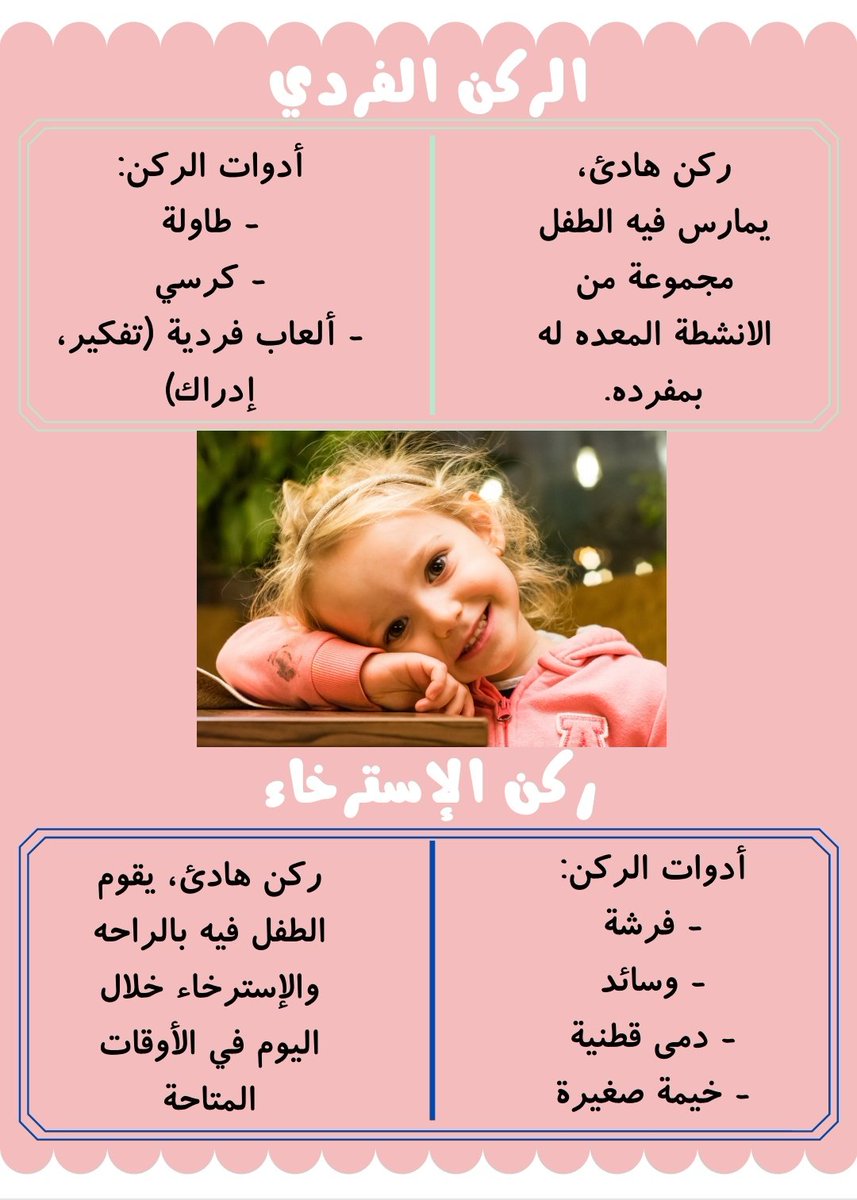 من الأركان المستحدثة في بعض الروضات، من الممكن دمج الاركان مع بعضهم مثلا: الركن الفردي يستبدل بطاولة في الركن الإدراكي، وركن الاسترخاء بكرسي مريح في ركن المكتبة✨ حسب الامكانيات: