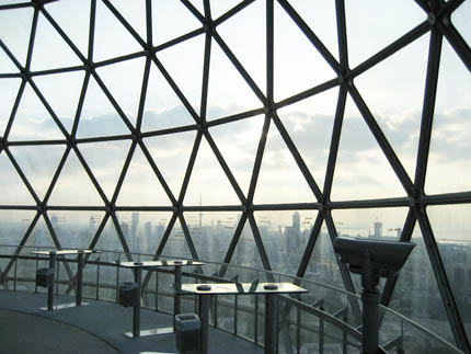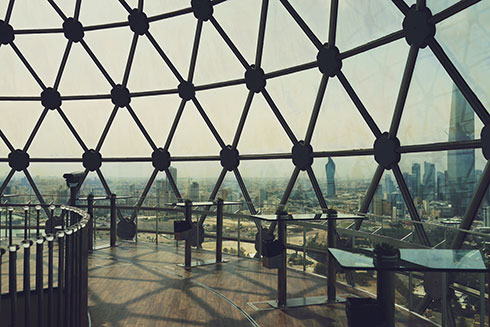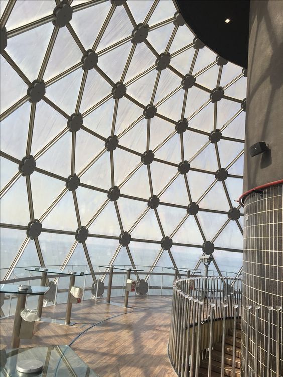 بسبب الشكل الكروي فقد تم استخدام المثلثات لتغطية الفراغ الكروي بالزجاج العاكس ووضعه في إطارات من الالمنيوم للسماح بالرؤية والاتصال بالخارج.