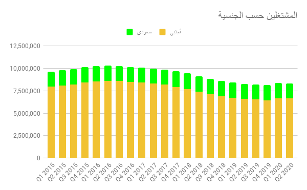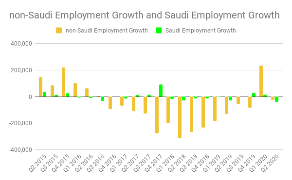 تظهر البيانات انخفاض توظيف القطاع الخاص بـ 64- ألف وظيفة منها 39- ألف وظيفة للسعوديين وهو أكبر انخفاض ربعي في وظائف السعوديين منذ فترة طويلة.