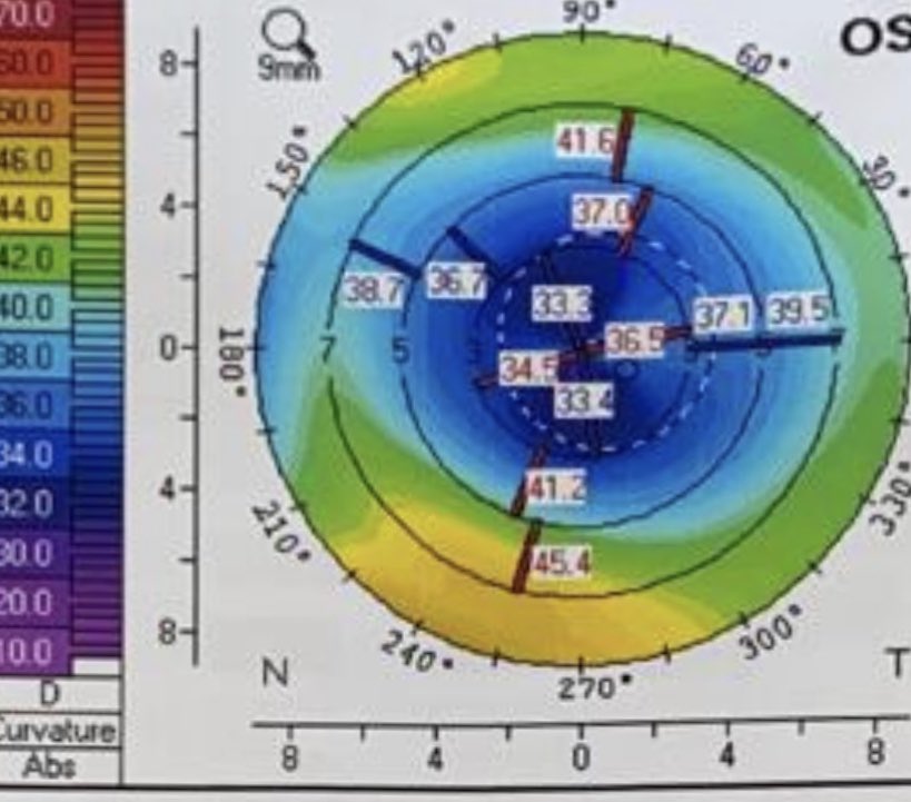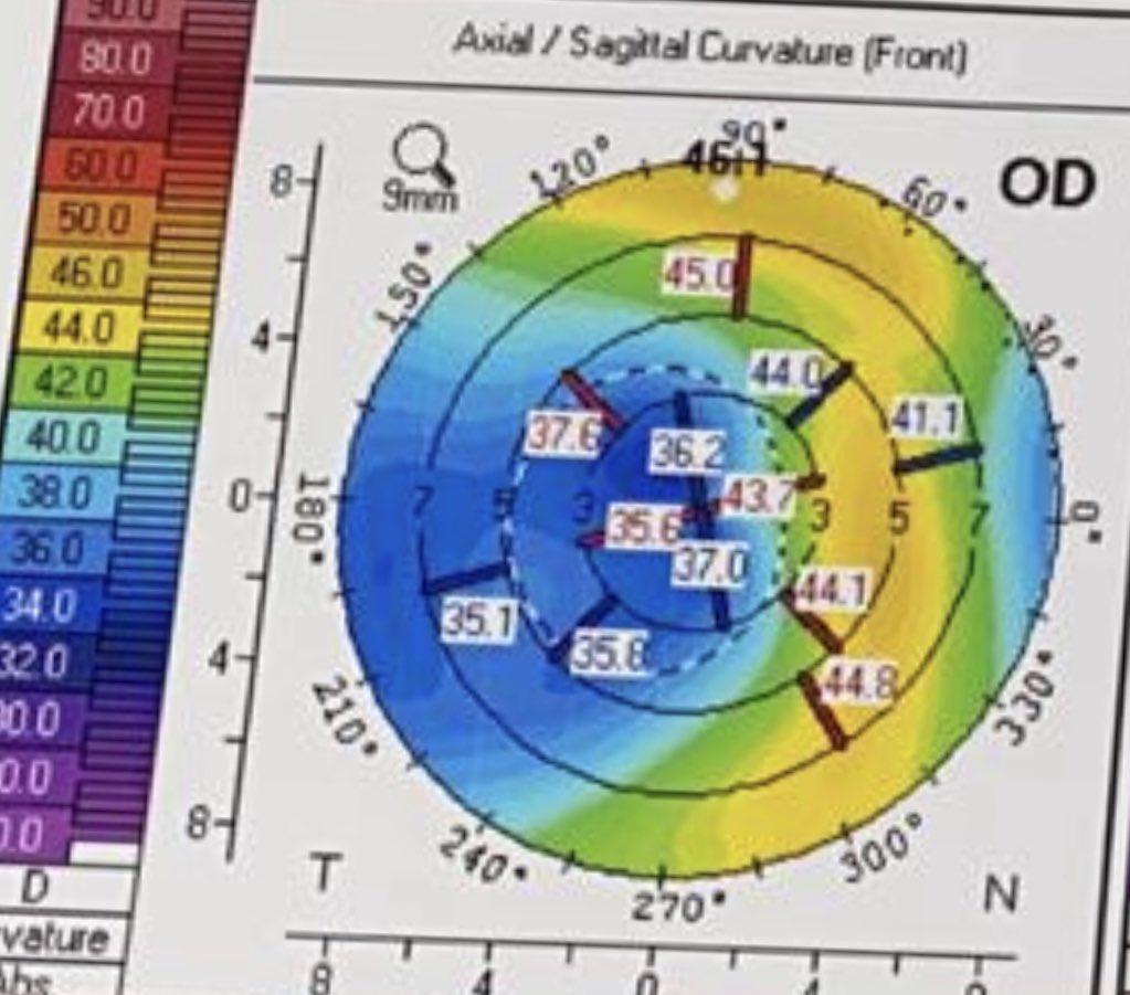 بالفعل هذي الحاله corneal ectasia post refractive Sx يعني حالة لانهيار القرنية بعد عمليه التصحيح بالليزر مع ان الجراح كان عامل عملية تثبيت في نفس الجلسة ايضا بس للاسف بعد سنتين بدت القرنية والنظر يضعف مجددا !!