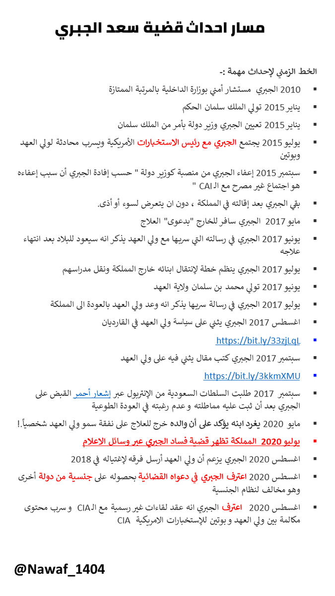 لنشاهد الخط الزمني لأحداث قضية الجبري لنعرف كيف تسلسلت الاحداث من تعينية ومرورًا بإقالته وخروجه بدعوى العلاج ، وتأكيد ابنه على ذلك ، وبعد ان خرجت قضية #فساد_الجبري ، اظهر جنسيته الاخرى واعلن العداء وصعد الامر اعلاميا بدعواه القضائية
