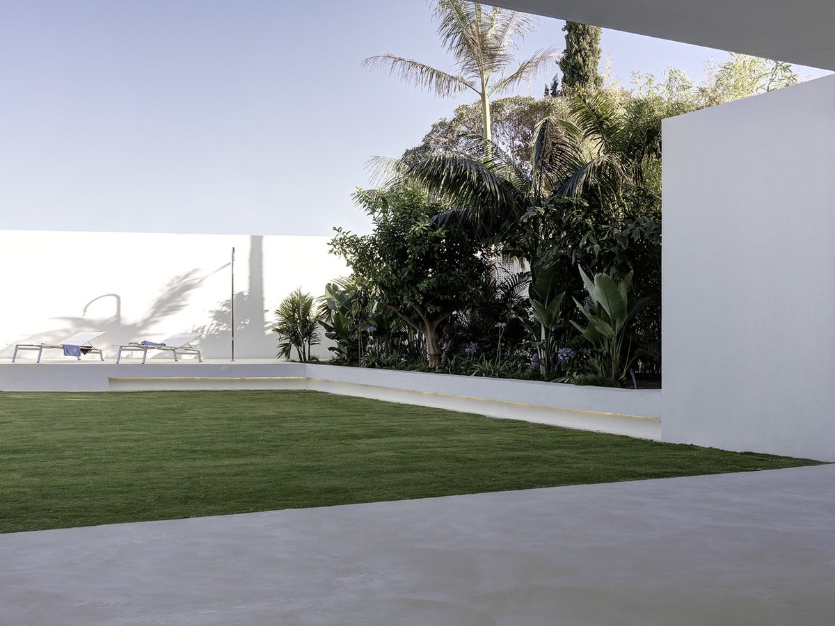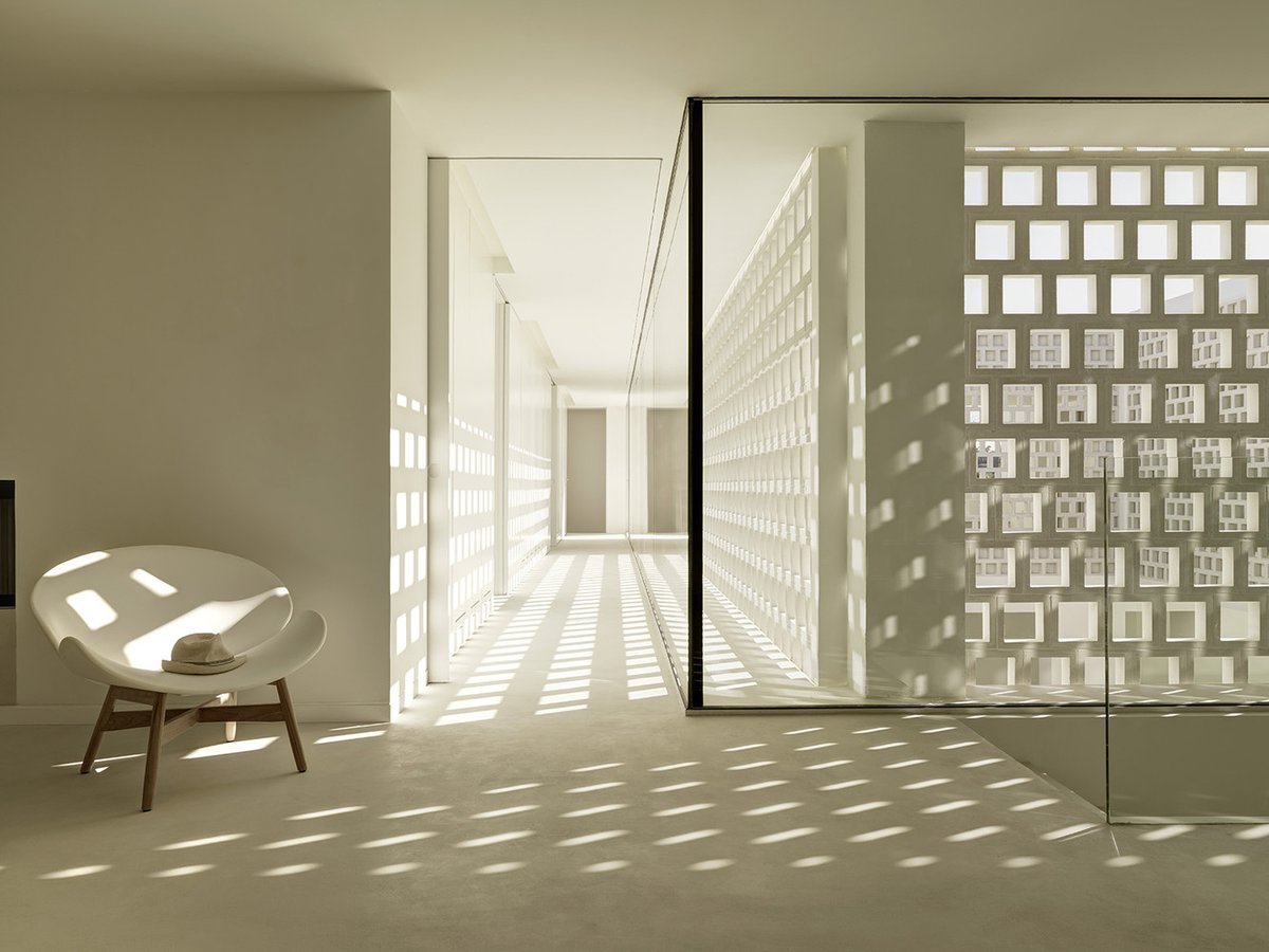 لكون المنزل تم تشطيبه بالكامل باللون الأبيض فإن الإضاءة أصبحت هي العنصر الرئيسي في تحول الكتلة إلى تحفة فنية في الليل , وظيفة وجمال واقتصاد .