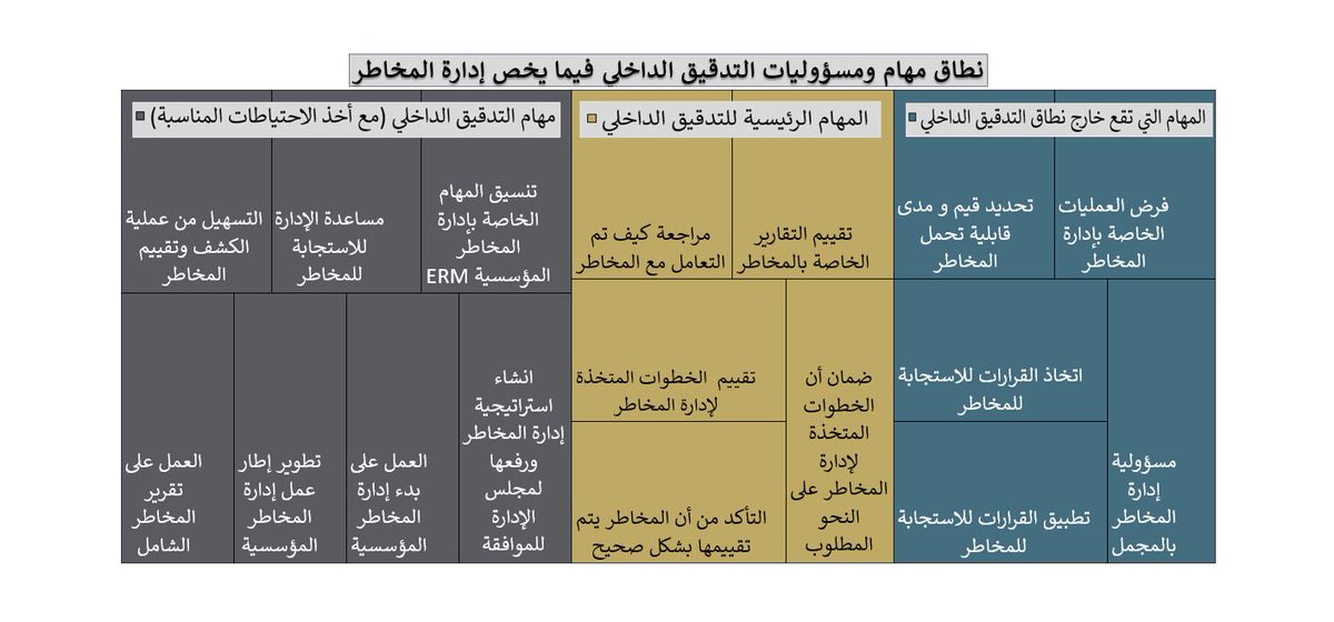 بحسب أفضل الممارسات فإن مرجعية إدارة المخاطر والتدقيق الداخلي يجب أن تختلف بحيث ألا يكون هناك شخص واحد مسؤول يرأس هذه الإدارات.