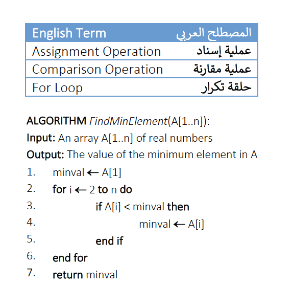 ملاحظة: هذه الخوارزمية تحتاج وحدة ذاكرة واحدة لتخزين المتغير (minval)، وبالتالي يمكن حساب كفاءة المساحة كدالة في حجم المدخلات على النحو التالي: