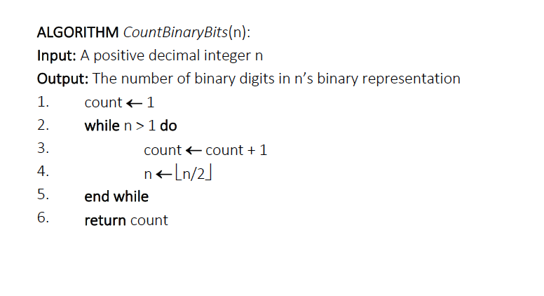 ولتوضيح ذلك نأخذ الرقم ١٥ كمثال، حيث تبدأ الخوارزمية بالعدد ١٥ ثم يتناقص بمقدار النصف في كل مرة (١٥، ٧، ٣، ١، ٠)، وعددها ٤ (log(15)+1=3+1=4) وبالتالي يمكن تعريف وقت التنفيذ للخوارزمية على النحو التالي: