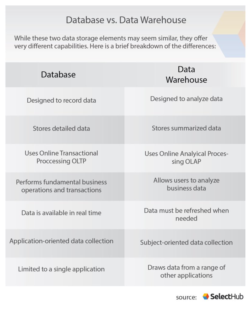 يغلب على ال DW أنها تكون للبيانات المنظمة بمعنى جداول أو ملفات الاكسل. لكن جمع البيانات الغير منظمة مثلاً من تويتر تكون في dataset وتحفظ غالبا كملف اكسل او csv. ويغلب على ال DW انها للتحليل الوصفي تقارير و لوحات معلومات.