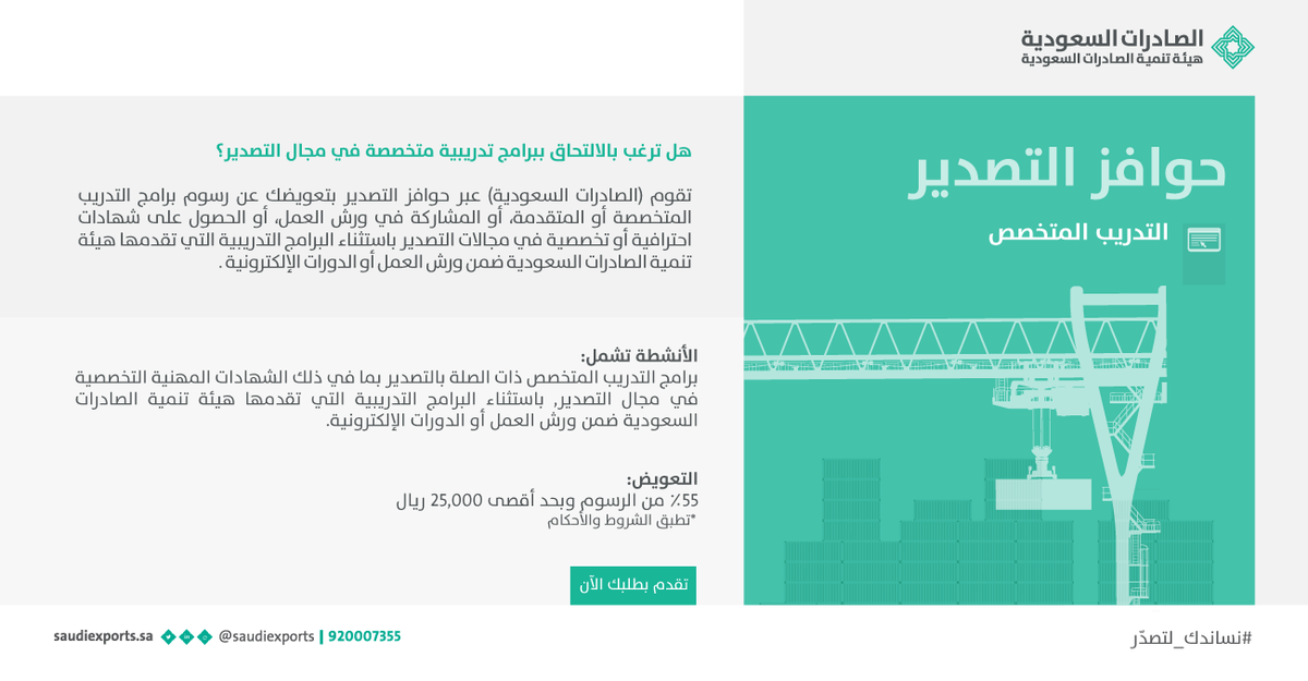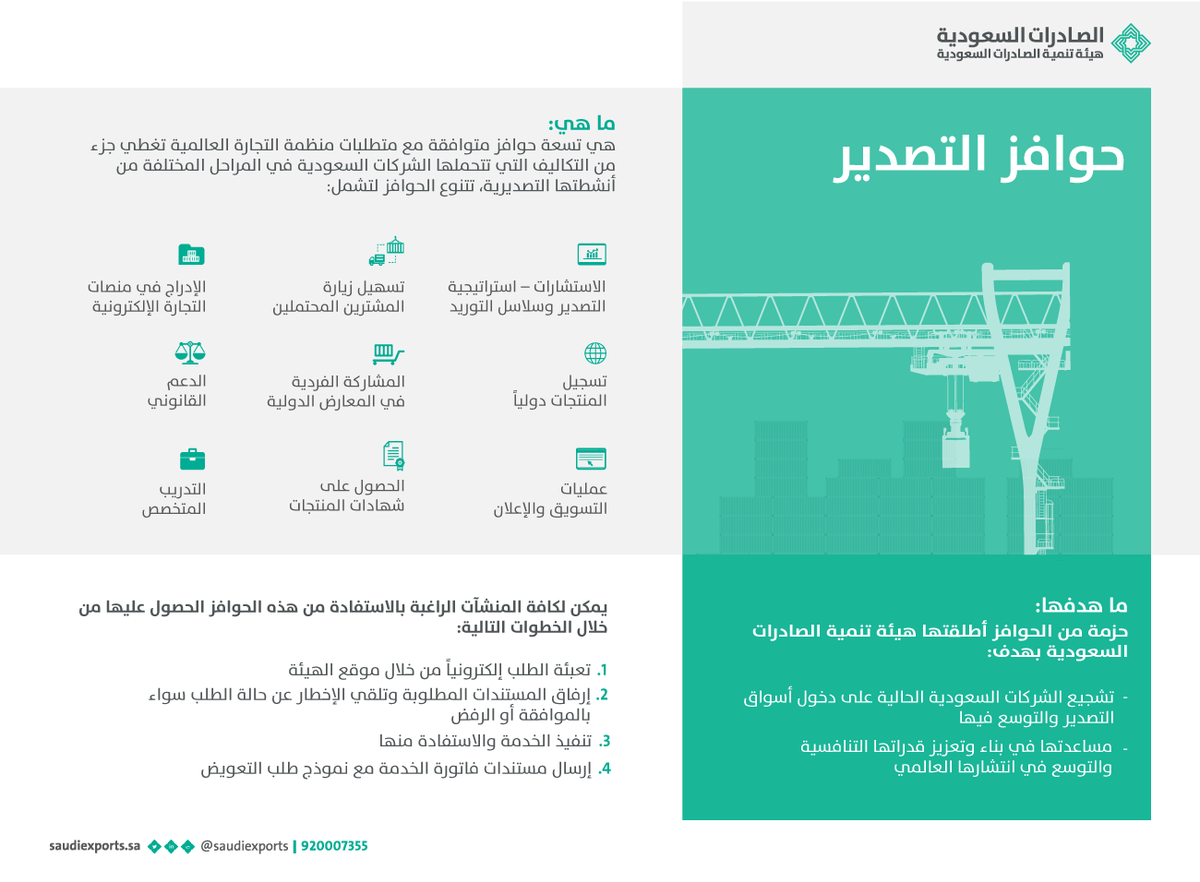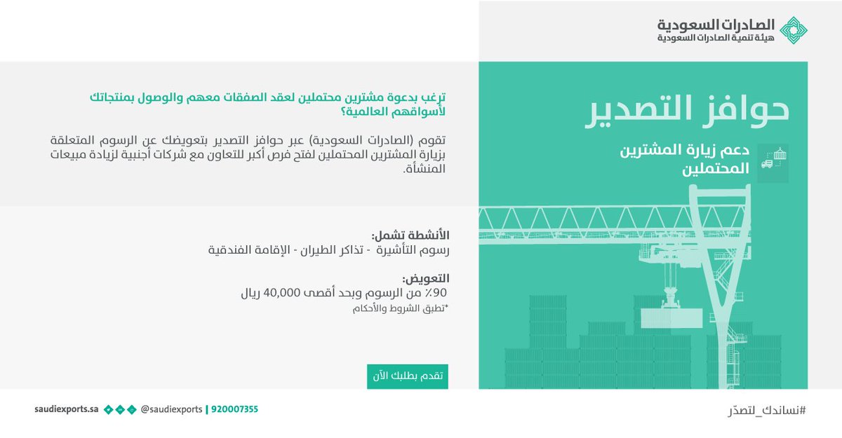 أطلقت هيئة تنمية #الصادرات_السعودية ٩ حوافز لتحفيز الشركات السعودية على التصدير منها تسجيل المنتجات دولياً والتسويق والإعلان عنها حيث تتحمل #هيئة_تنمية_الصادرات_السعودية تكاليف إعلان الشركات السعودية وتسويقها لمنتجاتها في الأسواق الخارجية