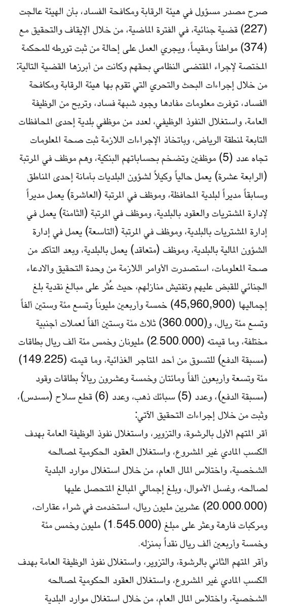 وجود شبهة فساد، وتربح من الوظيفة العامة، واستغلال النفوذ الوظيفي، لعدد من موظفي بلدية إحدى المحافظات التابعة لمنطقة الرياض، وباتخاذ الإجراءات اللازمة ثبت صحة المعلومات تجاه عدد (5) موظفين وتضخم بحساباتهم البنكية.
