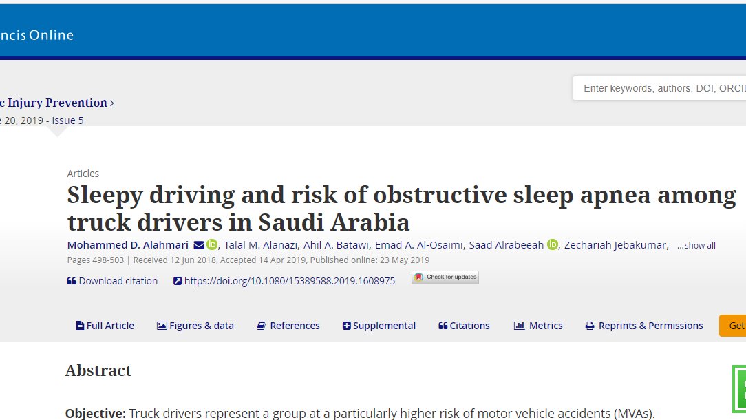 16- دراسةاجراها@Dr_MAlAhmari على سائقوا شاحنة في السعودية كان متوسط عمر السائقين 42.9 ± 9.7 سنة. الغالبية (94.7٪) قادوا أكثر من 5 ساعات في اليوم. تعرض 6.5 ٪ لحوادث خلال الأشهر الستة الماضية. 95٪ من المشاركين ناموا عن طريق الخطأ مرة واحدة على الأقل أثناء القيادة خلال 6 اشهر ماضية